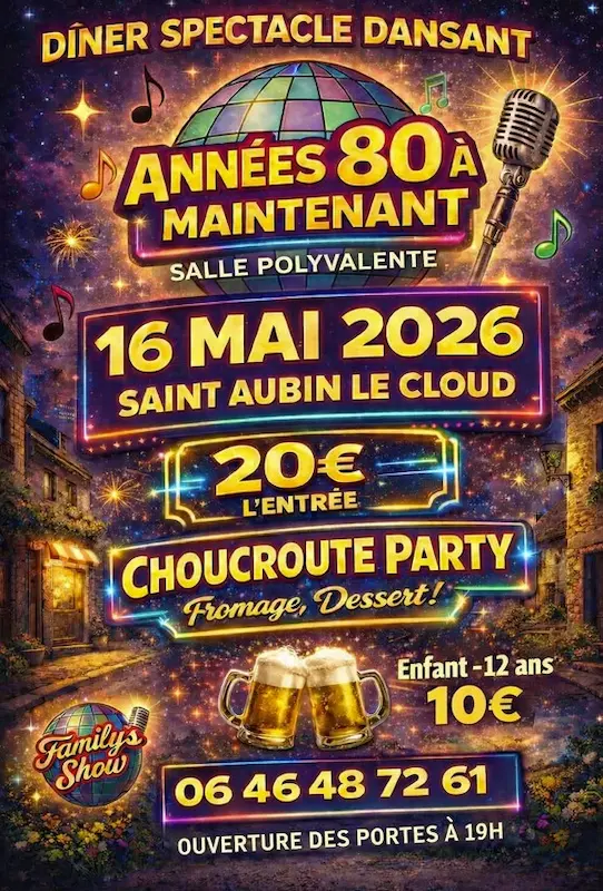 Dîner Spectacle Dansant Années 80 le 16 mai 2026 à 19H à Saint Aubun le Cloud